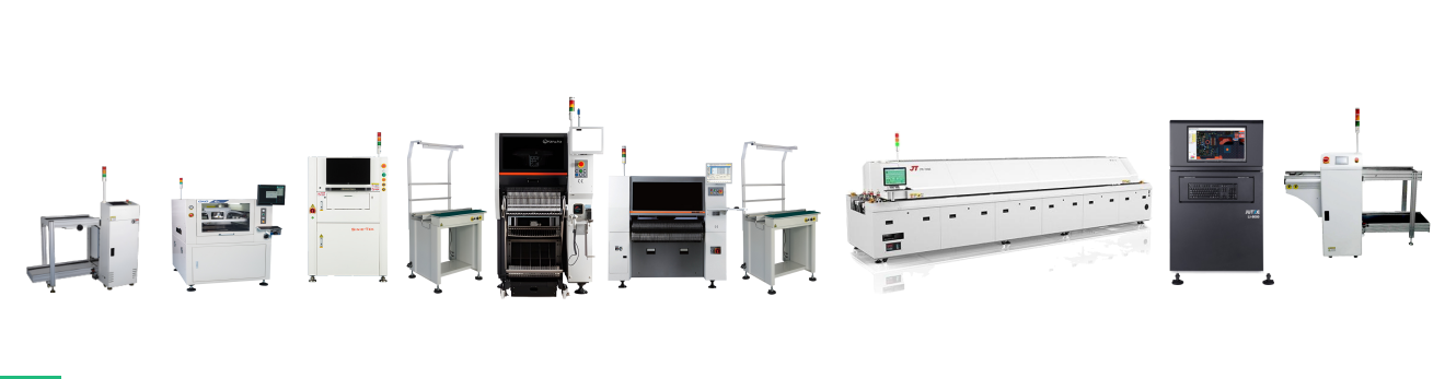 全自動(dòng)上板機(jī)→ 全自動(dòng)印刷機(jī)GKG GSE→思泰克SPI →接駁臺(tái) →HM520→ SM482 plus→ 接駁臺(tái)→ 勁拓回流焊→ 矩子在線AOI → 下板機(jī)(從左→ 右)